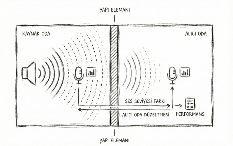 Bir yapı elemanının ses yalıtım performansını laboratuvar ortamında belirlemek için iki ayrı oda kullanılır. Bu odalardan biri kaynak oda, diğeri ise alıcı odadır. Yapı elemanı, bu iki oda arasına uygulandıktan sonra kaynak oda içerisinde omni hoparlör yardımıyla kararlı gürültü oluşturulur. Ölçüm sırasında hem kaynak oda, hem de alıcı odada mikrofonlar bulunur. Kaynak odadaki mikrofonlar hoparlör tarafından üretilen sesin seviyesini ölçerken, alıcı odadaki mikrofonlar yapı elemanından geçen sesin seviyesini ölçer. Bu iki ölçüm arasındaki fark ve alıcı odanın akustik özelliklerine göre hesaplanan düzeltmeler, yapı elemanın ses yalıtım performansını belirler.